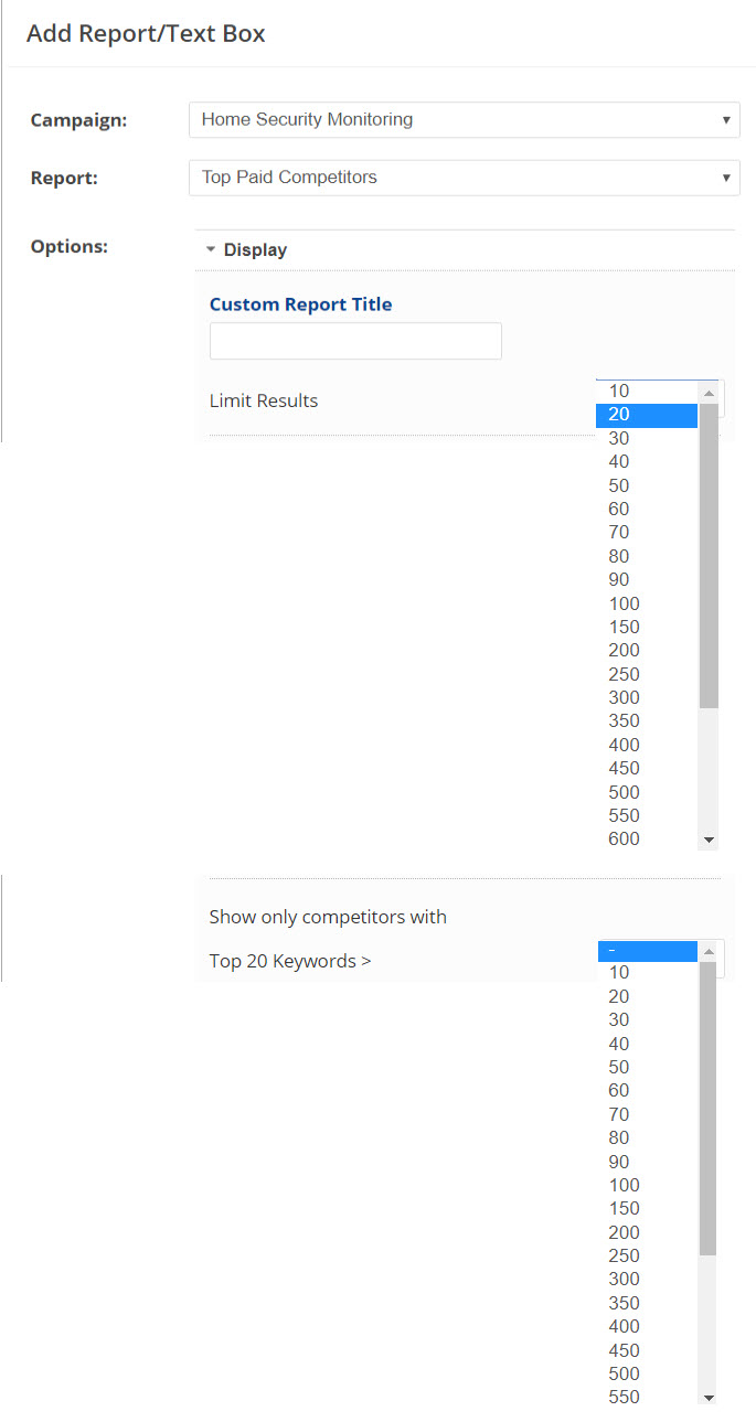 • PDF Report Content screen, then click the Add Report button and select the Campaign name and Report: Top Paid Competitors.