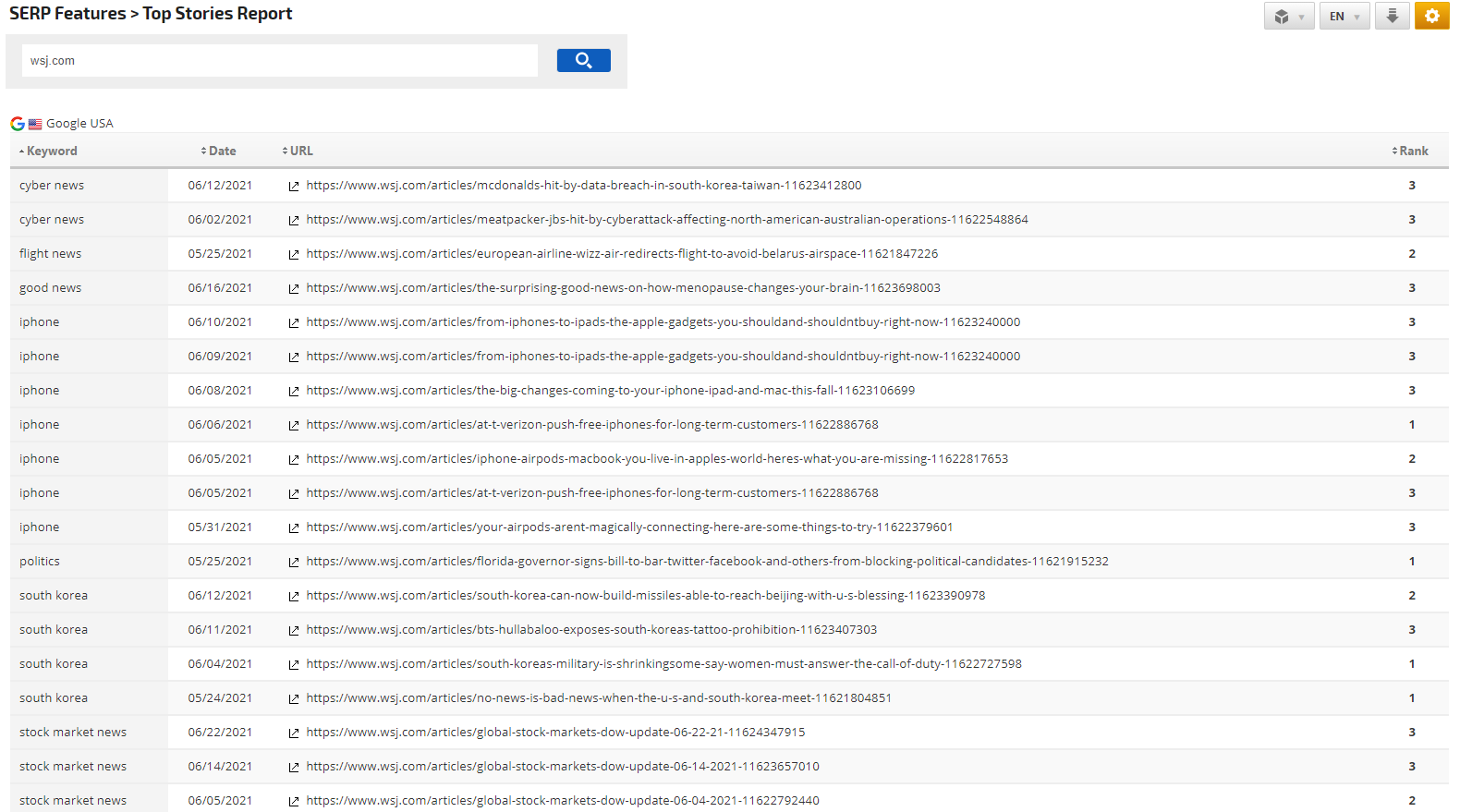 Top Stories is a report of SERP Top Stories appearing in the search results for the last 30 days. This report includes the date, URLs, and the rank for the keyword scored in the