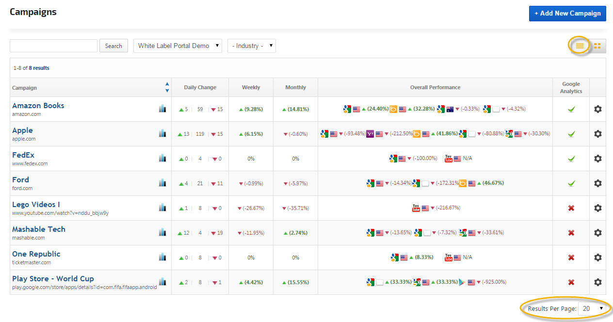 View Campaigns in Table or Website Thumbnail Grid