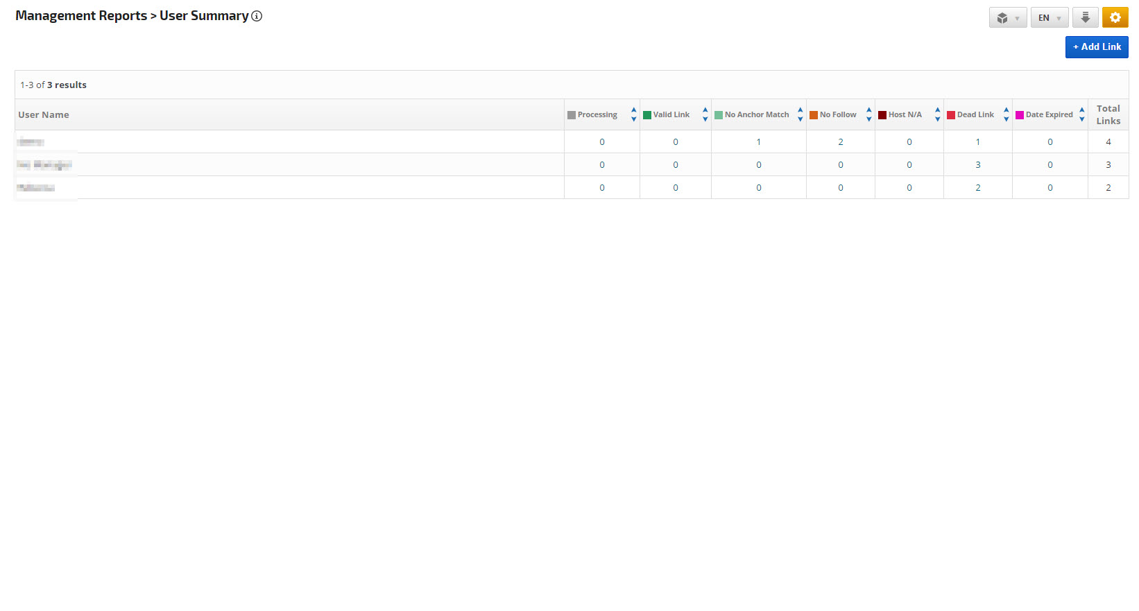 The User Summary report provides a summary of links by User that includes the number of links per status and the total number of links.