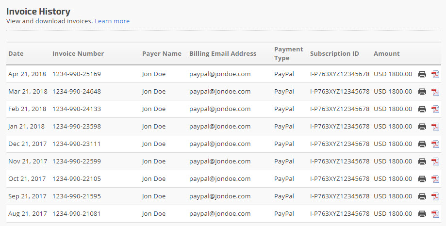 Click the printer icon to print an invoice or PDF icon to download the invoice to a PDF file.