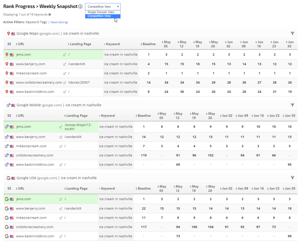 Weekly Rank for the selected keywords, keyword tags, and date range highlighting the primary domain rank vs. competitors' rank for each keyword and search engine tracked.