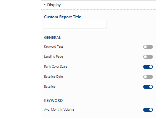 • Display Baseline by moving the slider to the right. Displays a column with the rank on the 1st day the keyword was added to the campaign, or if the keyword did not rank within the maximum supported results tracked by each search engine, then Baseline displays the first rank recorded by Rank Ranger for the Keyword when it did rank.