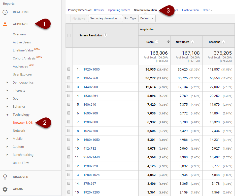 If you don't have a feel for the type of equipment that your potential audience might use, you could base your selection on what your current site visitors are using. Google Analytics offers a detailed report of screen resolution dimensions of visitors to your site, and you could start with that data to determine the setting(s) to choose in our reports. The Google Analytics report can be found in their Audience > Technology > Browser & OS section, you'll need to click the Screen Resolution option between the graph and table.