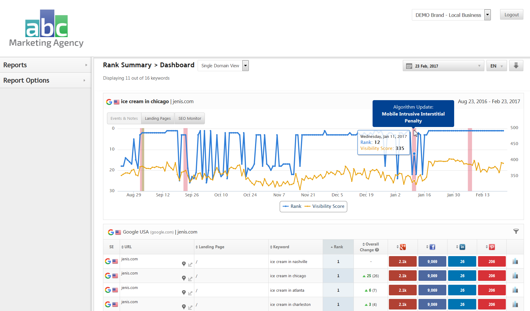 If enabled in Report Options, your clients can discover algorithm changes by hovering in graphs. Additional rank and traffic data, events, and notes can also be viewed with the interactive hover.