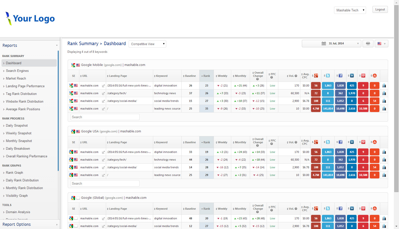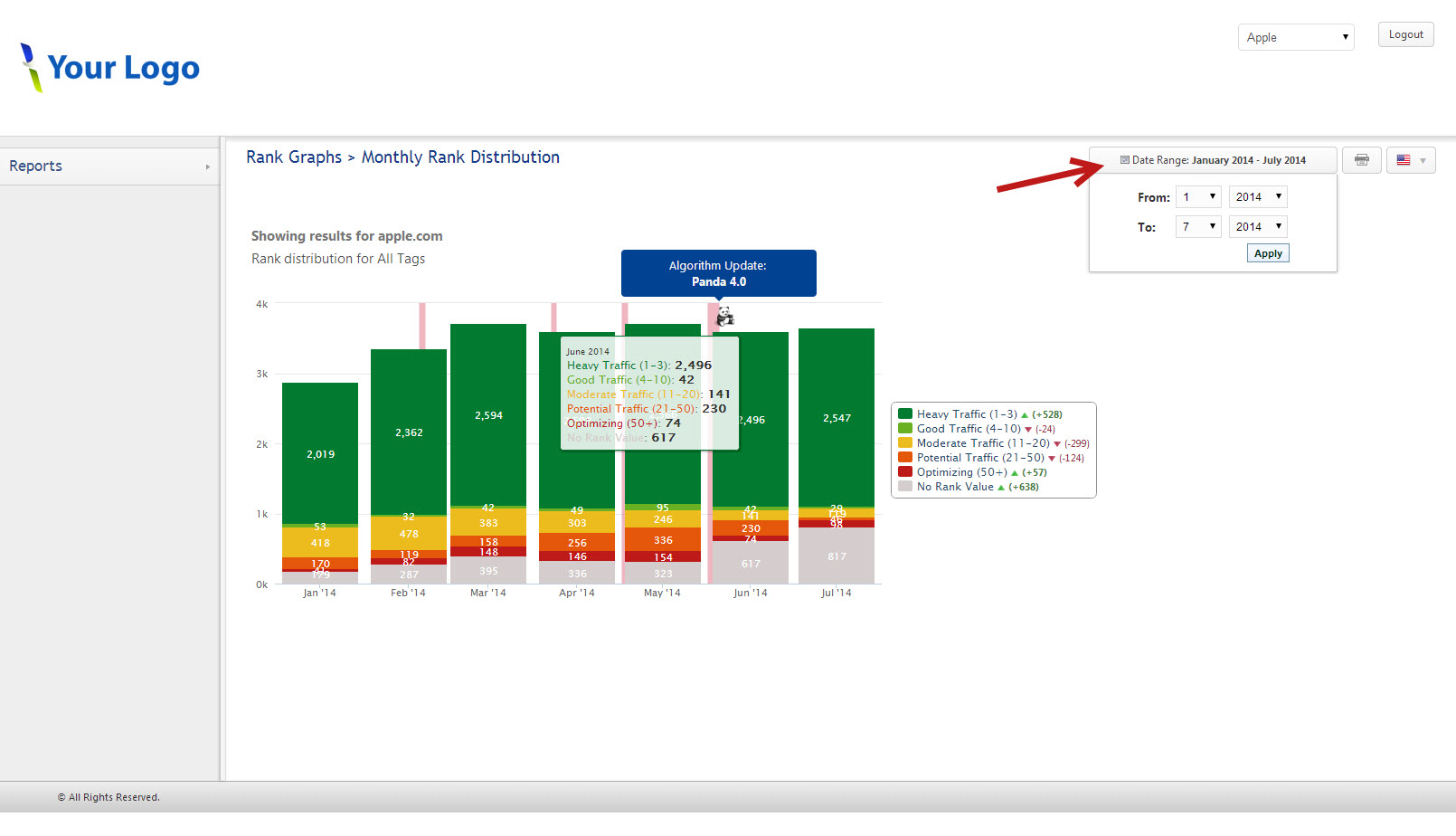 This feature allows you to provide your client with a customized online dashboard displaying our reports, under your logo. This is ideal for SEO companies and online marketing agencies that would like to give their clients the ability to be as hands-on as they like.