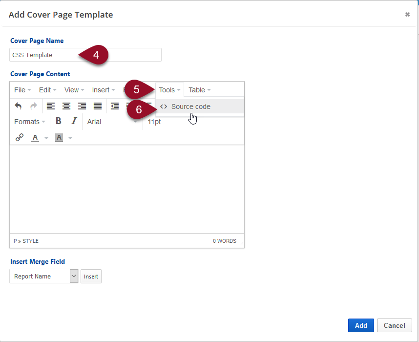 - Enter cover page content using the WYSIWYG editor to select text styles, insert images*, links, tables, etc.