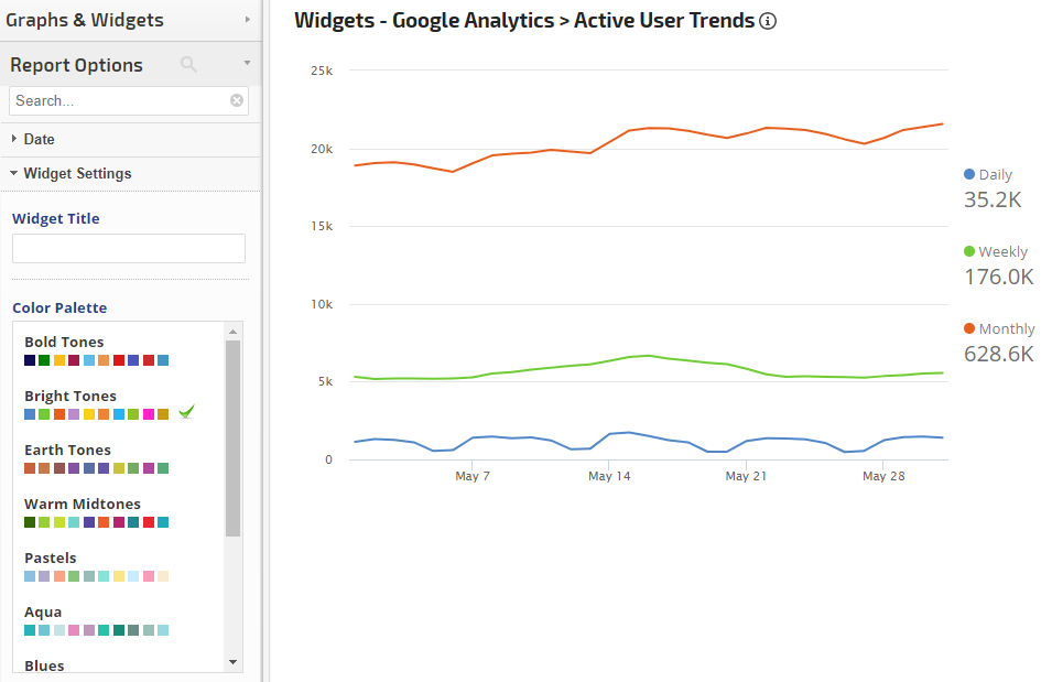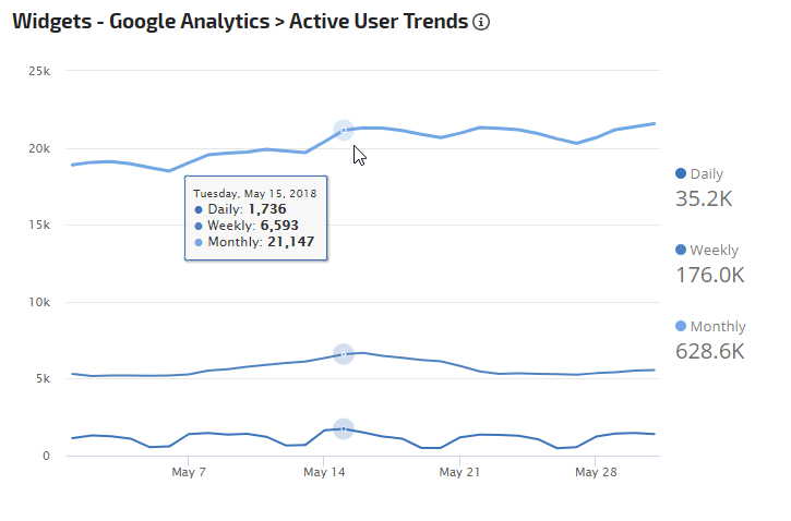 The Google Analytics Active User Trends widget presents daily, weekly and monthly totals for the selected analytics goals, segments and events.