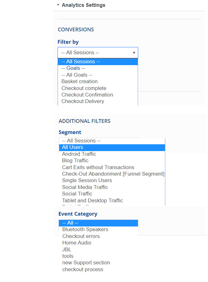 Filter by Event Category: choose from self-defined Events that have been created in the Google Analytics account for the tracked site.