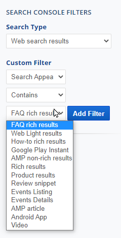 • Appearance: FAQ rich results, Web Light results, How-to rich results, Google Play Instant, AMP non-rich results, Rich results, Product results, Review snippet, Events Listing, Events Details, AMP article, Android App and Video