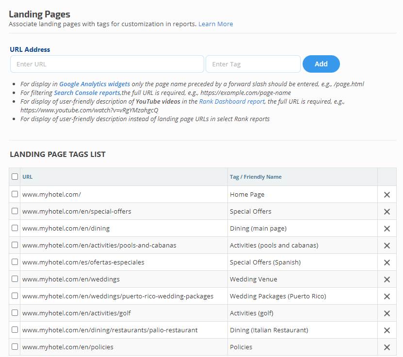 Landing Page Tags can be imported in the Campaign Settings > Landing Page screen, and are useful for sites that have content relating to a specific location or topic spread across multiple directories. You may add landing pages that exist in the primary domain being tracked in the campaign, along with tags for grouping those pages.
