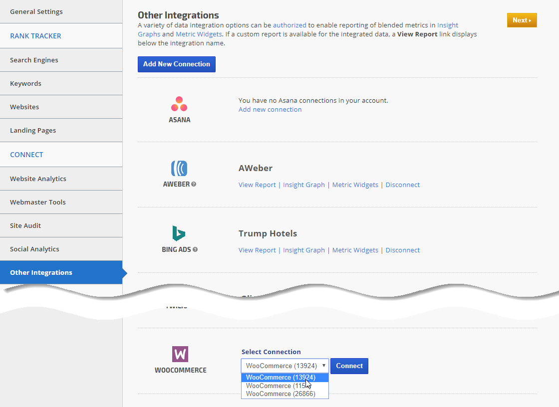 You can connect a campaign to your WooCommerce account if you'd like to include their e-commerce data for integration into your Rank Ranger graphs and widgets to display in white label dashboards and PDF reports.