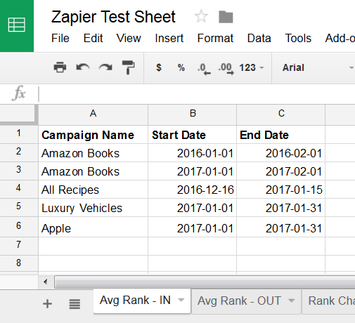 In this example, each new data row containing campaign name, date, and a number of days, added to a Google Sheet triggers an API request from Rank Ranger.
