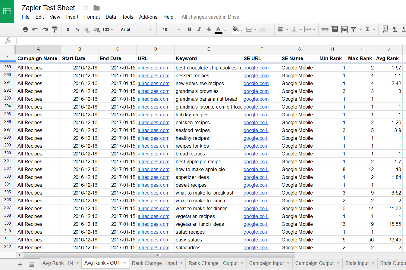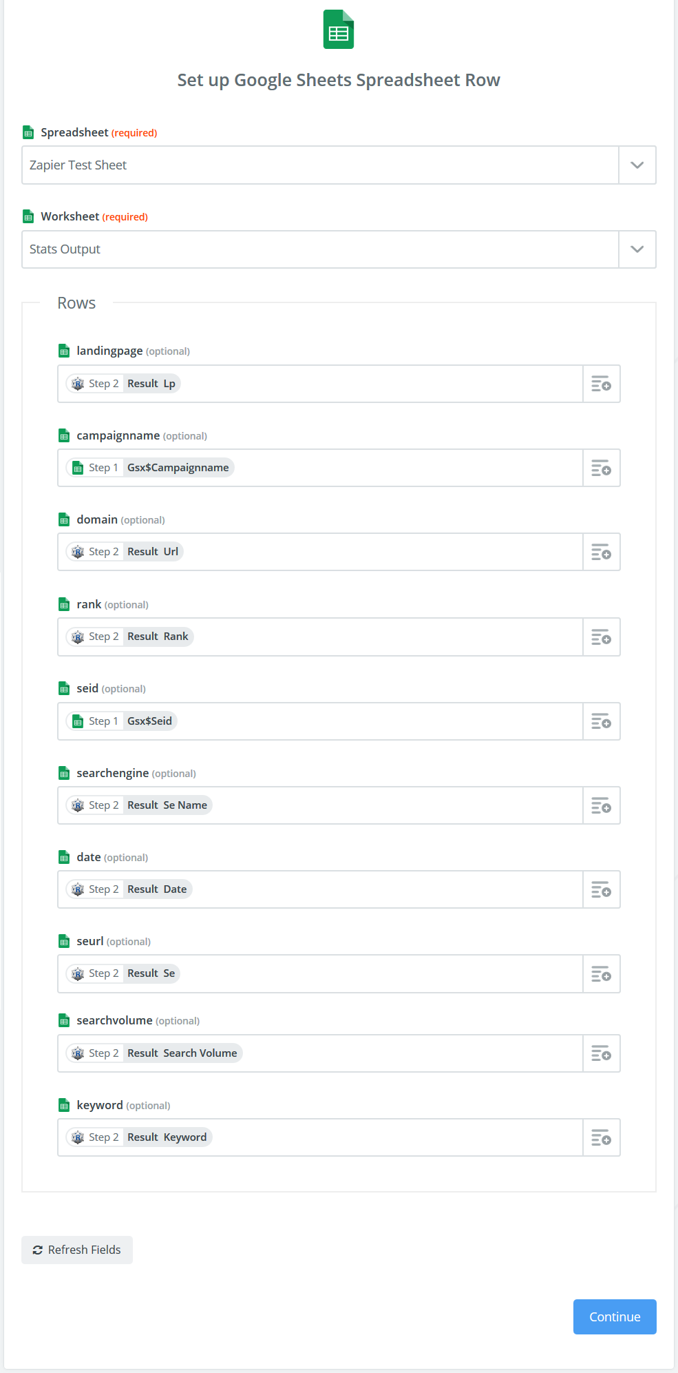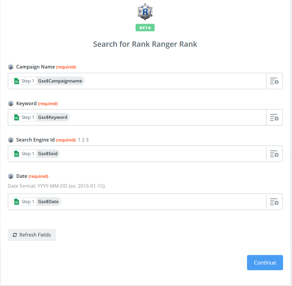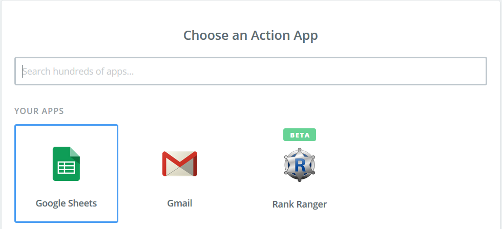 In this example, results are being sent to a new Google Sheet, however, you may choose from a large variety of Zapier Apps to utilize your Rank Ranger data (e.g., Gmail, MailChimp, etc.)
