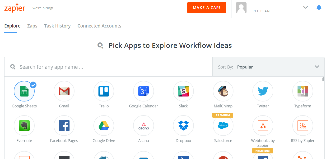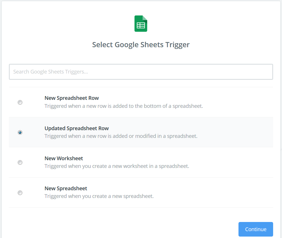 In this example, we will begin a Zap using Google Sheets as the Trigger App, there are many other options (e.g., Zapier Scheduler could be used to create a Zap that runs at the same time daily, weekly, or monthly).